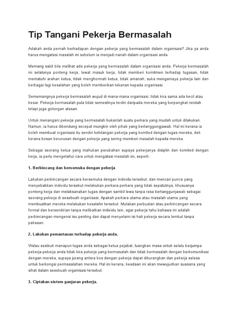 Isu disiplin pekerja yang seterusnya ialah perbuagan mencuri barang syarikat. Sekiranya kes disiplin pekerja tidak diuruskan dengan betul, kemungkinan besar kes tersebut tidak dapat disabitkan atau organisasi akan gagal di dalam perbicaraan. Flipped tutorial | tugasan karangan: Bagaimana cara menjadi disiplin kerja? Memelihara disiplin adalah suatu proses dari serangkaian tingkatan yang harus diperhatikan oleh para penegak disiplin. 6 caraâ sederhana dan efektif bangun disiplin kerja. Bil kenalpasti masalah punca masalah cadangan penyelesaian. Natrah jusof september 27, 2018. Bezanya hanyalah dari segi jumlah kes samada banyak atau sedikit atau samada kes tersebut kronik atau tidak. Mengikut kamus dewan edisi baru terbitan dbp, kl (1989) mendefinisikan disiplin sebagai latihan terutamanya pemikiran dan kelakuan supaya boleh mengawal diri sendiri. Disiplin kerja di kantor bukan hanya masalah dominasi peraturan dan hukuman yang diterapkan oleh perusahaan. 1.1 definisi dan pengertian kerja dari beragam sumber. Pengenalan pengenalan pengenalan pengenalan secara umum manuskrip ini sangat baik untuk diterbitkan oleh pihak.